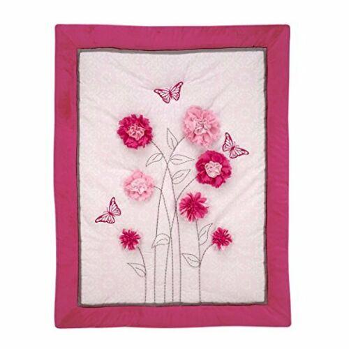 Cheerfully bright butterfly and flowers create this vibrant collection. Detailed applique and embroidery captures our floral design in shades of pink and white. This gorgeous bedding set is accented with blooming flower appliques and a blend of fabric textures of cotton and polyester.